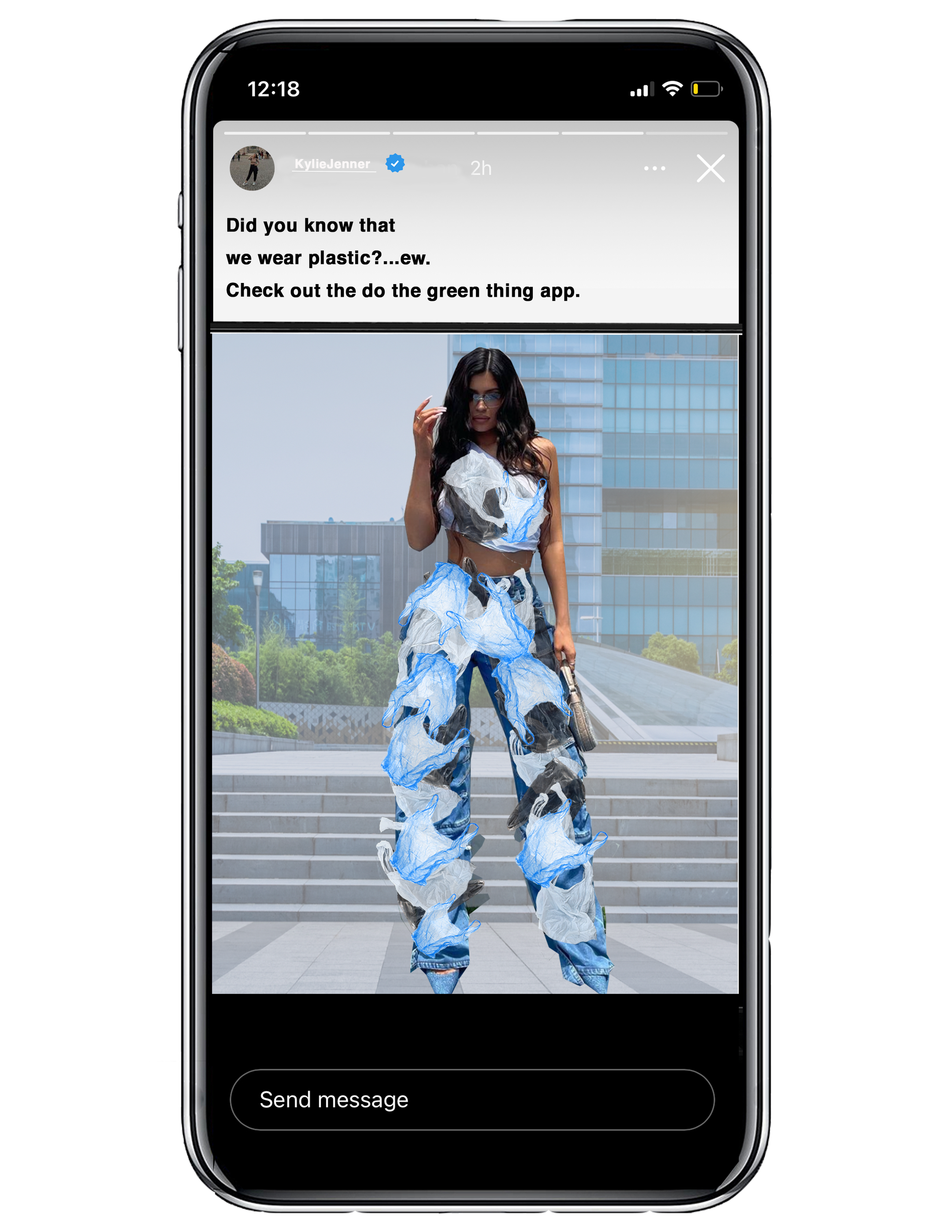Social media influencers are invited to the billboard and will see their clothes change to plastic which is then posted on their social media.
